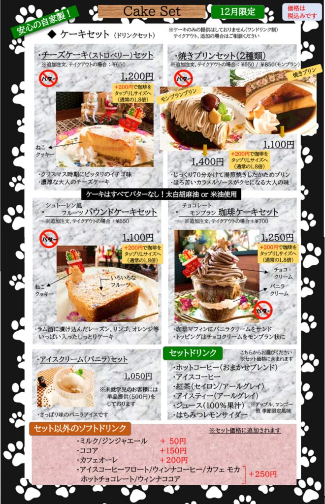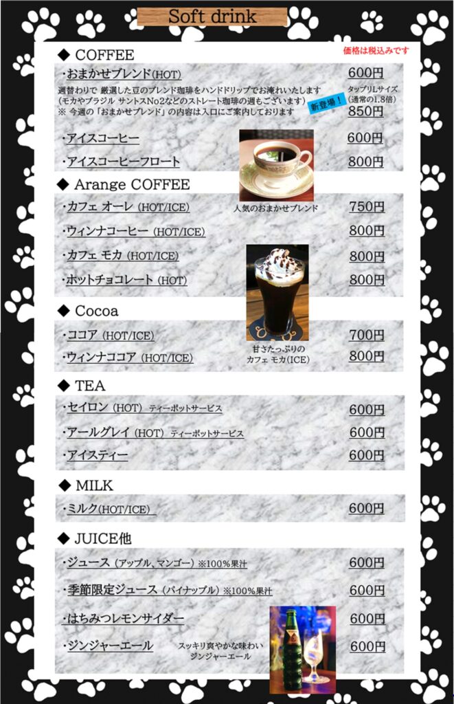 ※クリックで拡大できます カフェ エトワールのメニュー表紙 珈琲などのソフトドリンクのご案内季節限定のドリンクもございます アルコール類もご用意しておりますノンアルのはちみつレモンサイダー、美味しいですよ 簡単な軽食メニューもございます 月替わりでのスイーツメニューです。12月メニューをご覧になれます エトワールのニャンズ達のご紹介TVや雑誌に出たコたちもいます